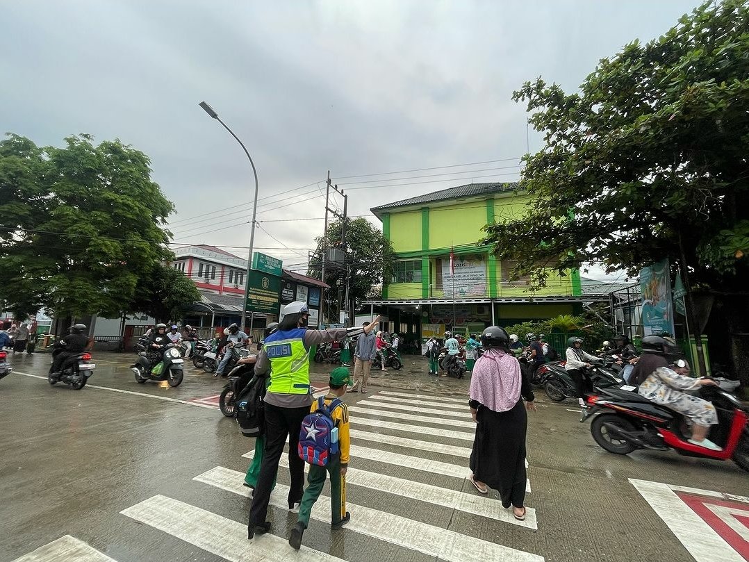 Anggota Sat Lantas menurunkan Polwan melakukan pengaturan lalu lintas antisipasi kemacetan saat jam masuk sekolah, serta memberikan keamanan dan keselamatan pada anak-anak yang akan menyebrang dan pengguna jalan.