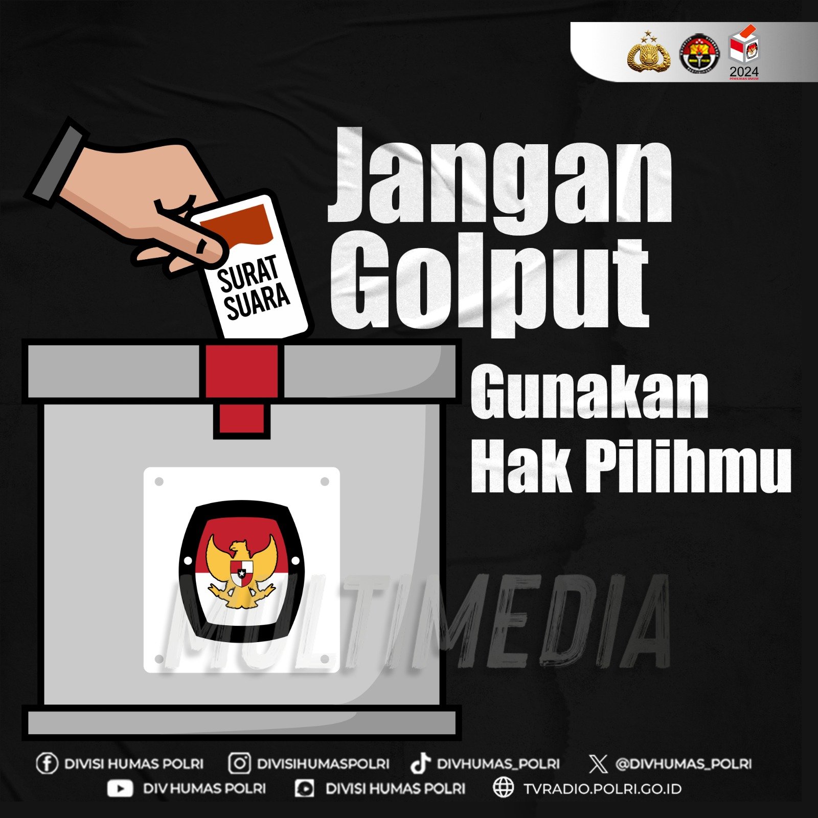 Sobat Polri, Pemilu 2024 tinggal hitungan hari loh. Yuk #WujudkanPemiluBerkualitas datang ke TPS terdekat untuk gunakan hak pilihmu demi masa depan bangsa yang lebih baik dan Kawal Demokrasi Bersama.