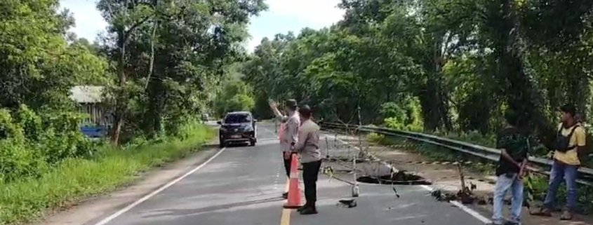 Polsek Kota Bangun Pastikan Arus Lalin Lancar Saat Pemasangan Box Culvert Di Jalan Longsor