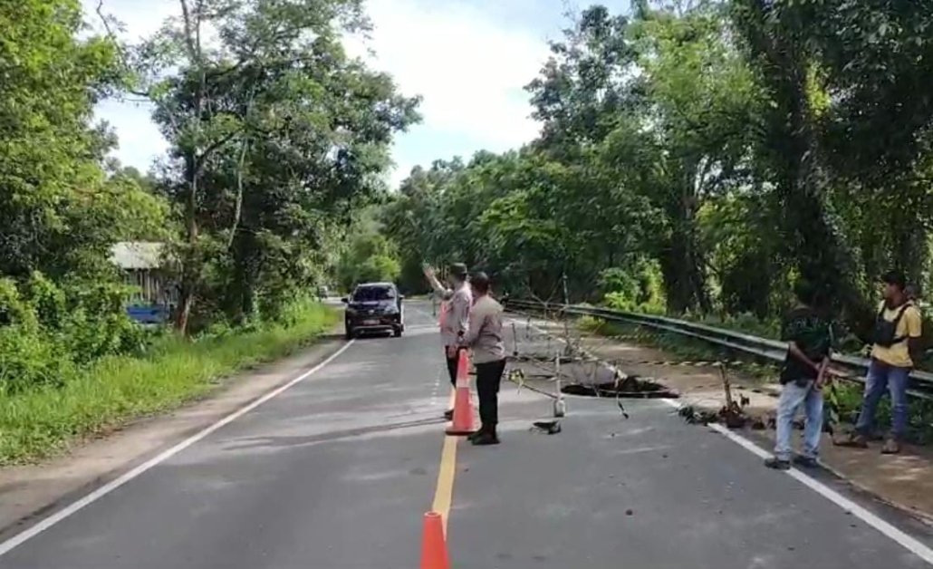 Polsek Kota Bangun Pastikan Arus Lalin Lancar Saat Pemasangan Box Culvert Di Jalan Longsor