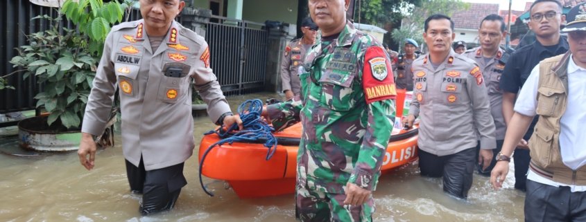 Kapolres Metro Depok Kombes Pol Abdul Waras bersama jajaran dan unsur TNI meninjau langsung kondisi banjir di Kelurahan Sawangan Baru, Kecamatan Bojongsari.
