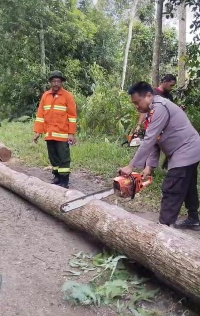Aipda Sudarsono bersama tim gabungan melakukan pembersihan pohon tumbang dan pengaturan arus lalu lintas buka tutup. Kegiatan ini selesai pukul 17.00 WITA dengan situasi aman dan terkendali.