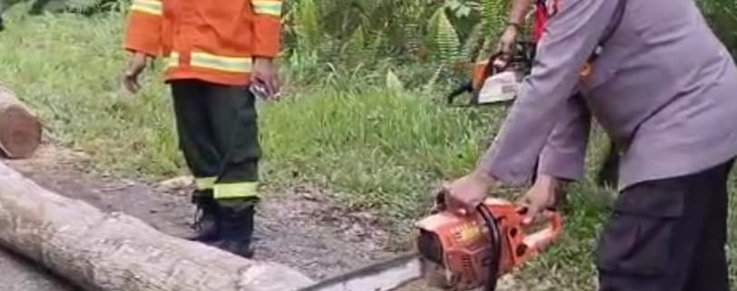 Polsek Loa Janan Bersama Relawan dan Dishut Evakuasi Pohon Tumbang Di Jalan Poros Balikpapan-Samarinda KM 60