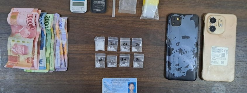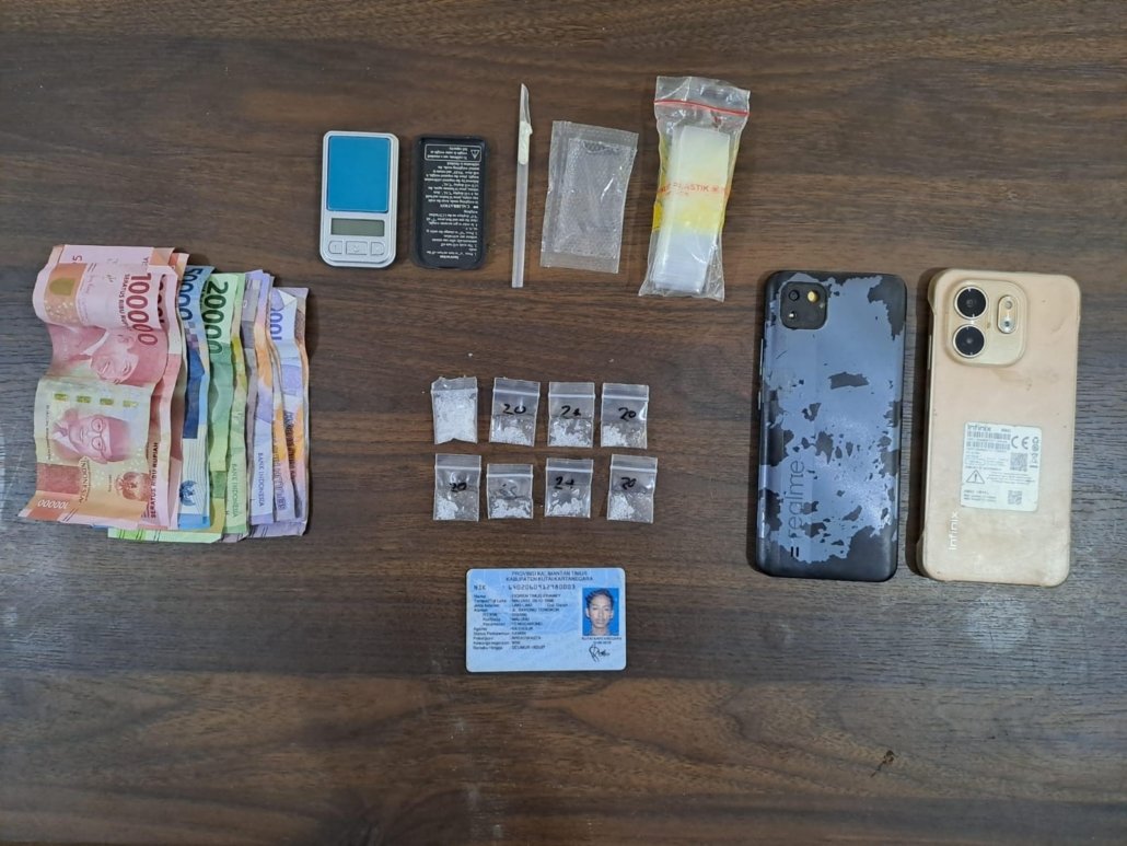 Dari hasil penggeledahan, polisi berhasil menyita barang bukti berupa delapan bungkus sabu dengan berat kotor 3,24 gram, satu lembar plastik klip bening, satu bendel plastik klip, satu sendok takar dari sedotan plastik, dua unit handphone, serta uang tunai Rp600.000.