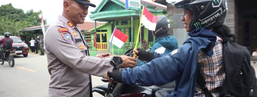 Polres Kutai Kartanegara Bagikan Bendera Merah Putih di Loa Kulu, Bangkitkan Semangat Nasionalisme