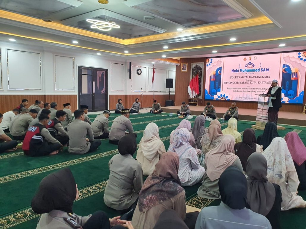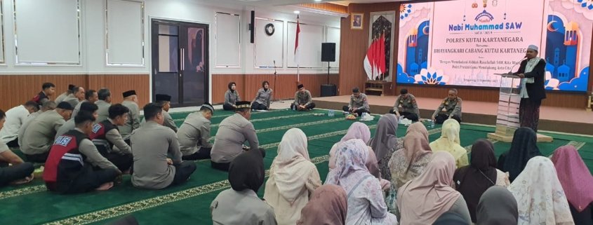 Kegiatan yang mengangkat tema “Dengan Meneladani Akhlak Rasulullah SAW, Kita Wujudkan Polri Presisi Guna Mendukung Asta Cita” tersebut dihadiri Wakapolres Kutai Kartanegara Kompol M. Aldy Harjastya, Kabag SDM Kompol Zainal Arifin, para pejabat utama, personel Polres, ASN, serta jajaran Bhayangkari Cabang Kutai Kartanegara.