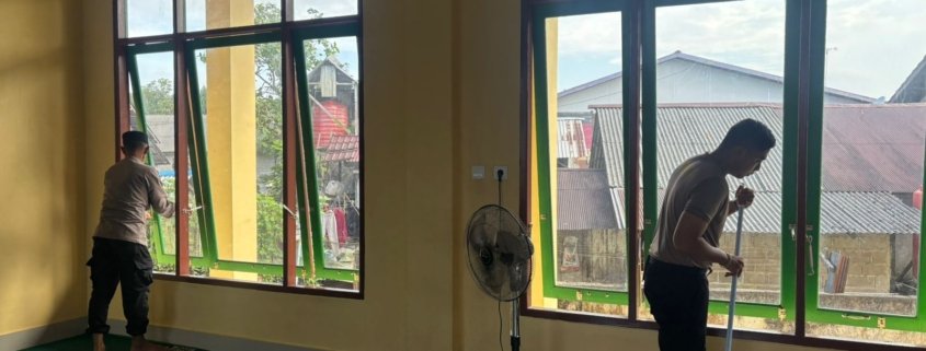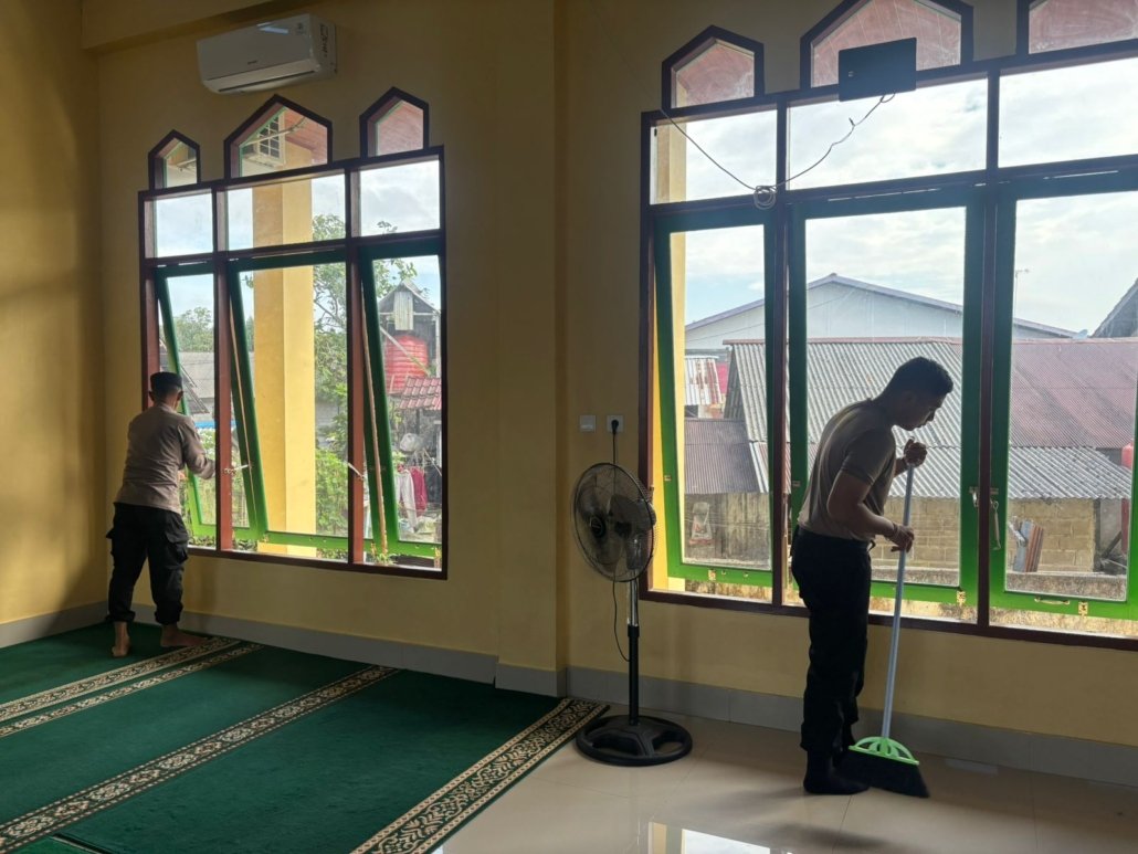 Dalam kegiatan tersebut, personel kepolisian bersama-sama membersihkan area sekitar langgar, merapikan lingkungan, serta mengajak masyarakat untuk peduli terhadap kebersihan.