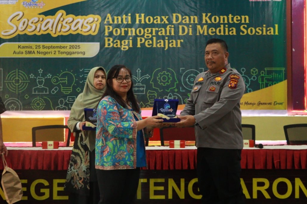 Kukar – Polres Kutai Kartanegara melalui Kasi Humas, IPTU Maryono, turut hadir sebagai narasumber dalam kegiatan sosialisasi Anti Hoaks dan Konten Pornografi di Media Sosial yang digelar di SMA Negeri 2 Tenggarong, Kamis (25/9/2025).