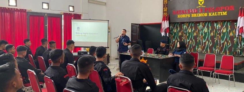 Samarinda – Dalam upaya meningkatkan kualitas sumber daya manusia di lingkungan kepolisian, Batalyon B Pelopor Satbrimob Polda Kalimantan Timur menggandeng Universitas Terbuka (UT) untuk melaksanakan kegiatan sosialisasi program perkuliahan bagi para personel. Kegiatan ini berlangsung di Aula Mako Batalyon B Pelopor, Samarinda Seberang, pada Senin (13/10/2025).