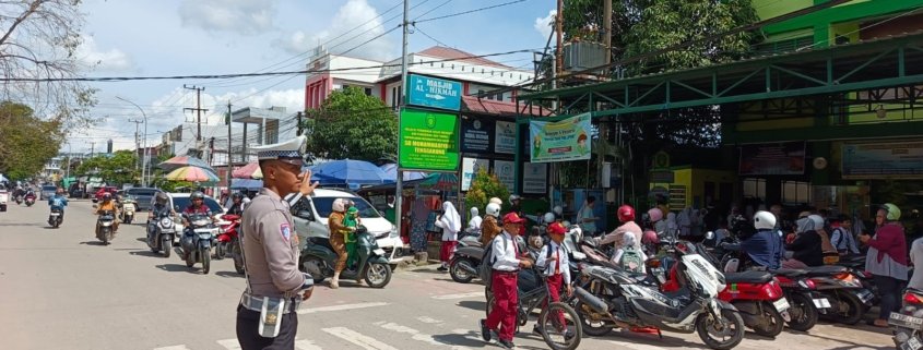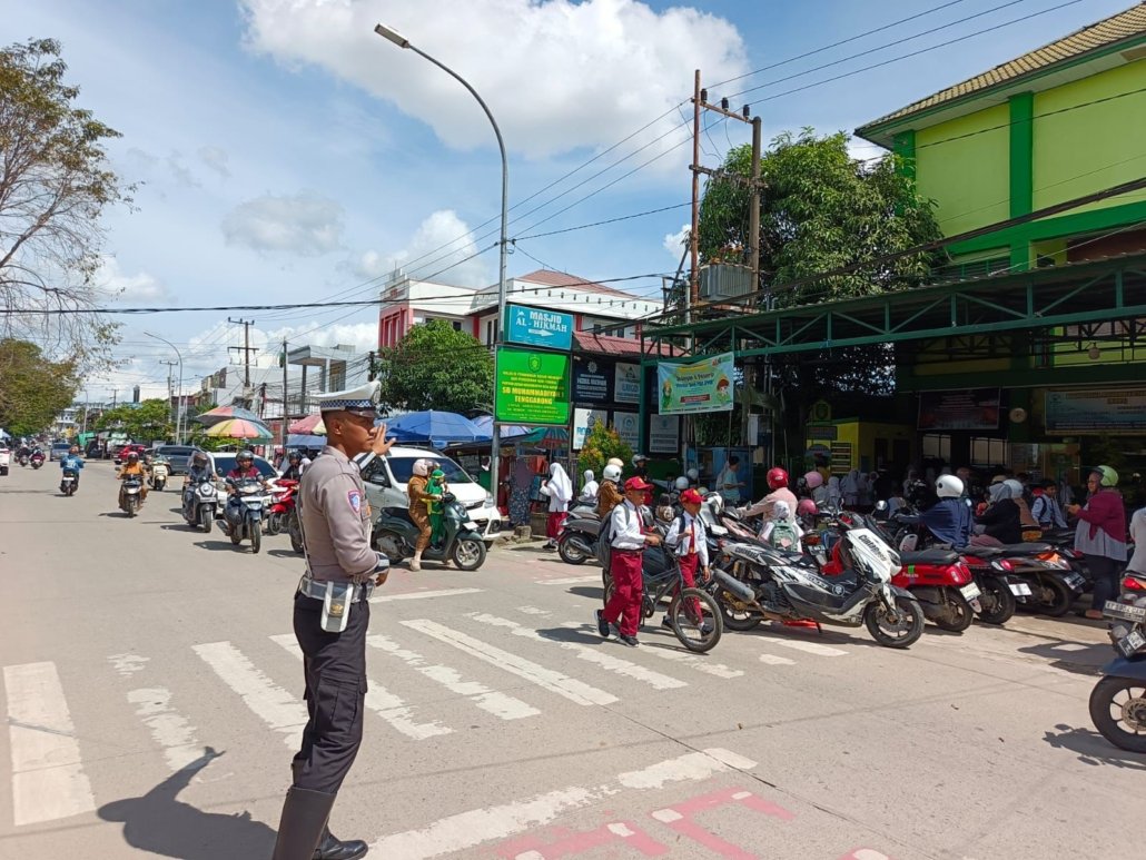 “Personel membantu siswa menyeberang jalan, mengatur kendaraan penjemput agar tidak mengganggu arus lalu lintas, serta memberikan imbauan secara humanis kepada pengendara yang tidak menggunakan helm,” ujar AKP Ahmad Fandoli.