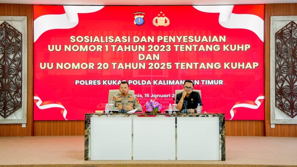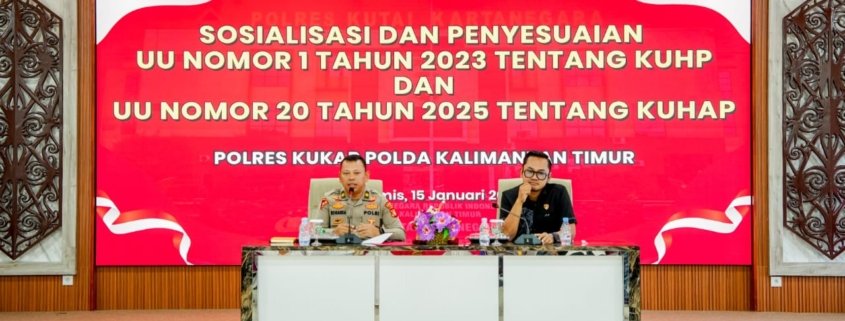 Kukar – Polres Kutai Kartanegara Polda Kalimantan Timur menggelar sosialisasi dan penyesuaian Undang-Undang Nomor 1 Tahun 2023 tentang KUHP serta Undang-Undang Nomor 20 Tahun 2025 tentang KUHAP sebagai langkah strategis meningkatkan pemahaman personel terhadap regulasi hukum yang baru.