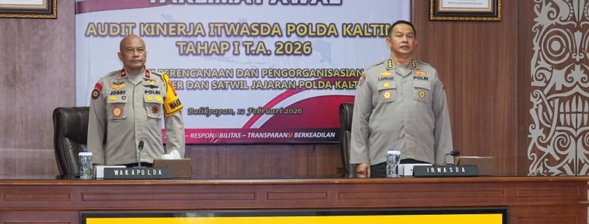 Tribratanews.kaltim.polri.go.id, Balikpapan – Wakapolda Kalimantan Timur Brigjen Pol Adrianto Jossy Kusumo, S.H., M.Han., membuka secara resmi Taklimat Awal Audit Kinerja Itwasda Polda Kaltim Tahap I TA.2026 Aspek Perencanaan dan Pengorganisasian, yang dilaksanakan di Rupatama Polda Kaltim, Kamis (12/02/26).