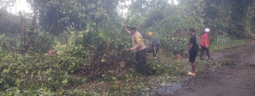 Bhabinkamtibmas Desa Tani Harapan Bersama Relawan Bersihkan Pohon Tumbang di Jalur Balikpapan–Samarinda