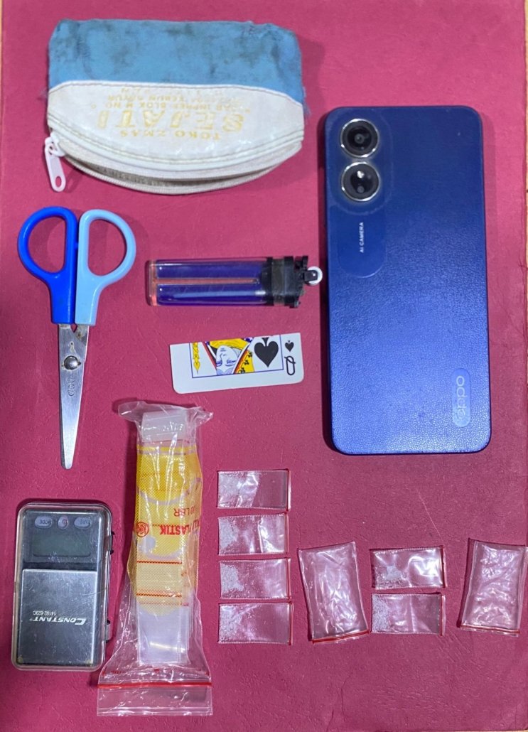 Tak hanya narkoba, petugas juga mengamankan sejumlah barang bukti pendukung yang memperkuat dugaan aktivitas pengedaran, di antaranya satu unit timbangan digital merk Constant, satu bendel plastik klip (bungkus sabu), satu unit ponsel Oppo A17 warna biru, alat takar yang terbuat dari potongan kartu remi dan dompet kecil dan alat potong (gunting).