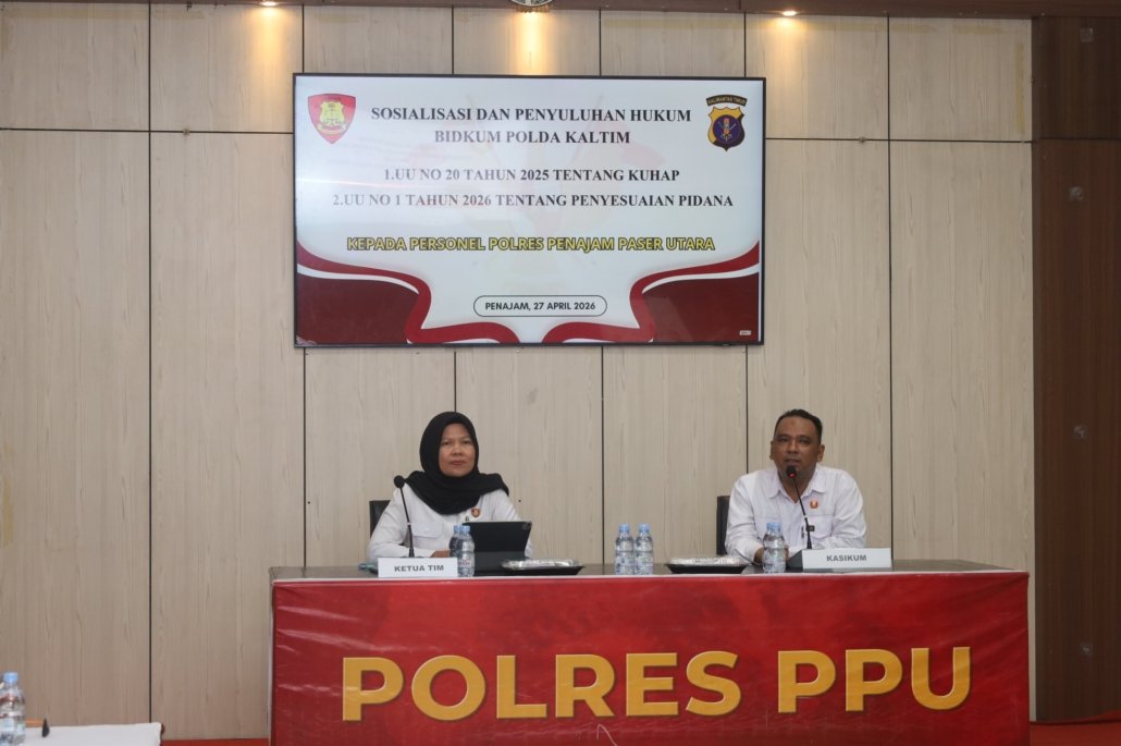 Sosialisasi dipimpin oleh Ketua Tim Bidkum Polda Kaltim, AKBP Dr. Muntini, S.E., M.H., bersama tim, serta dihadiri Kasikum Polres PPU AKP Achmad Hadi Siswoyo, S.H., M.H., dan pejabat utama Polres PPU.