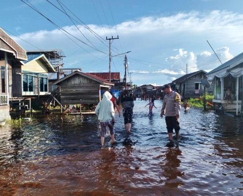 Polsek Muara Kaman Pantau Banjir Yang Melanda Desa Muara Kaman Ulu, Pastikan Masyarakat Tetap Aman