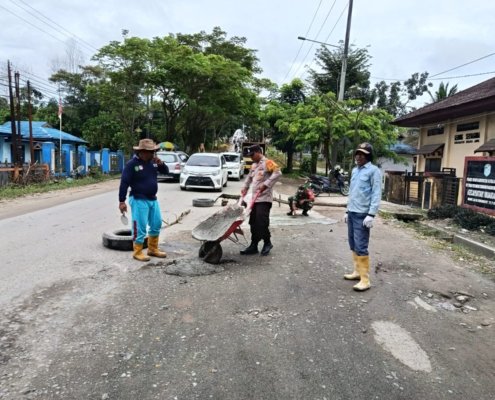 Gotong Royong Perbaiki Jalan Rusak Bersama Masyarakat, Bentuk Sinergi Bhabinkamtibmas Polsek Muara Jawa