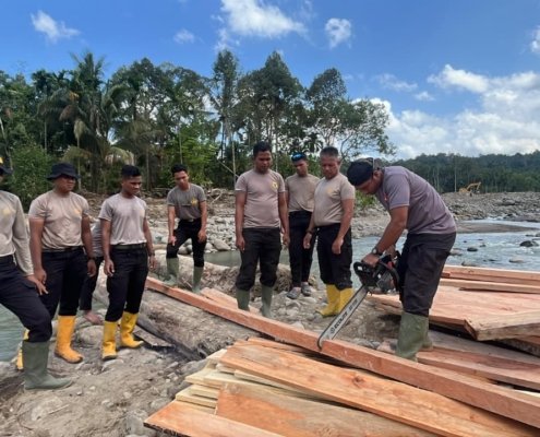 Terus Bergerak Pulihkan Konektivitas Masyarakat, Personel BKO Sat Brimob Polda Kaltim Bangun Jembatan Darurat di Aceh Utara