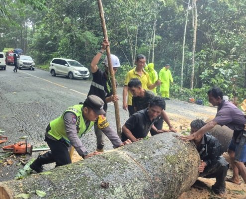 Bhabinkamtibmas Bersama Warga Gotong Royong Bersihkan Pohon Tumbang di Km 32 dan Km 46 Loa Janan