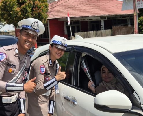 Menjelang HUT ke-80 RI, Polres Kutai Kartanegara Bagikan Bendera Merah Putih dan Bunga kepada Pengendara